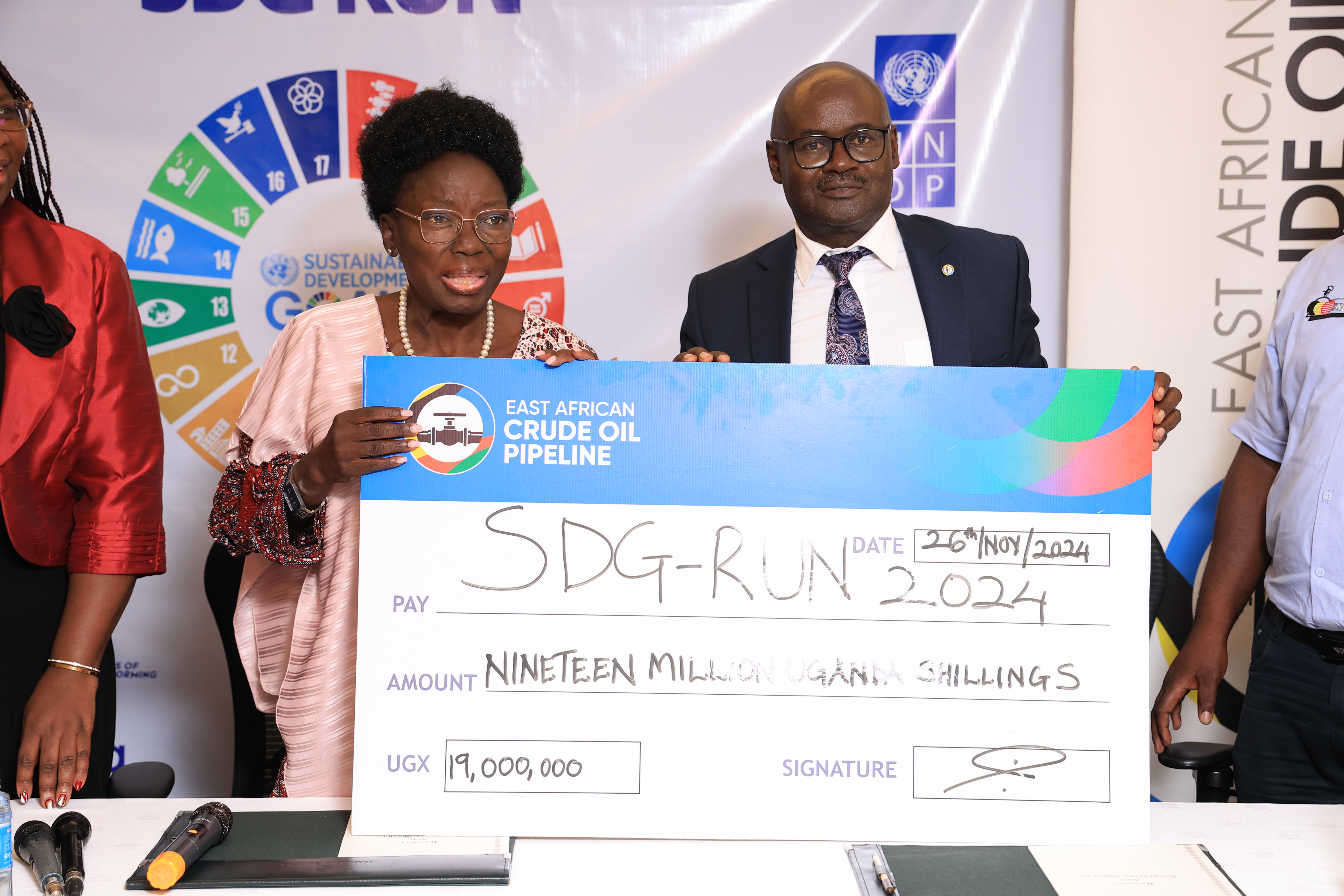 As part of its contribution to this year’s SDG Run, EACOP donated $5,000 toward the establishment of regional tree nurseries, which aim to raise 20 million indigenous trees for reforestation. During the press briefing, Our Deputy Managing Director JB. Habumugisha handed over a symbolic cheque to the 1st Deputy Prime Minister and Minister for East African Affairs, Rt. Hon. Rebecca Alitwala Kadaga, who is also the Patron of the SDG Run.